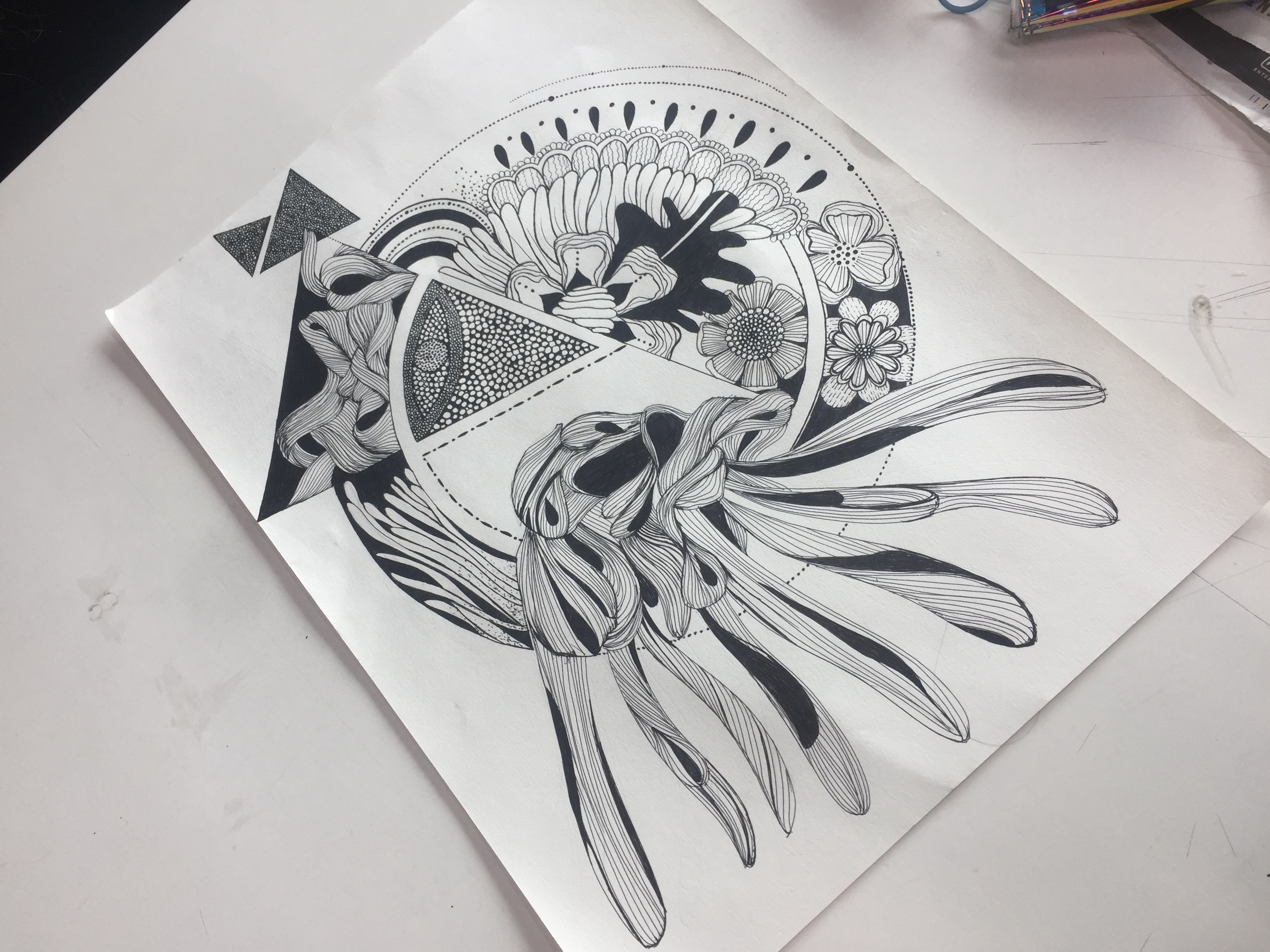In this project I made an evil eye that keeps us positive(away from negativity) just like Oswald does. I’ve made flowers and leaves that makes me feels happy and pleasant. The flowy lines represent easy going personality of Oswald. All the shapes are connected to each other which represents strength(watching Oswald makes me feel strong). The whole drawing is in the shapes of the silhouette of Oswald (the hat, the body, and the tentacles).