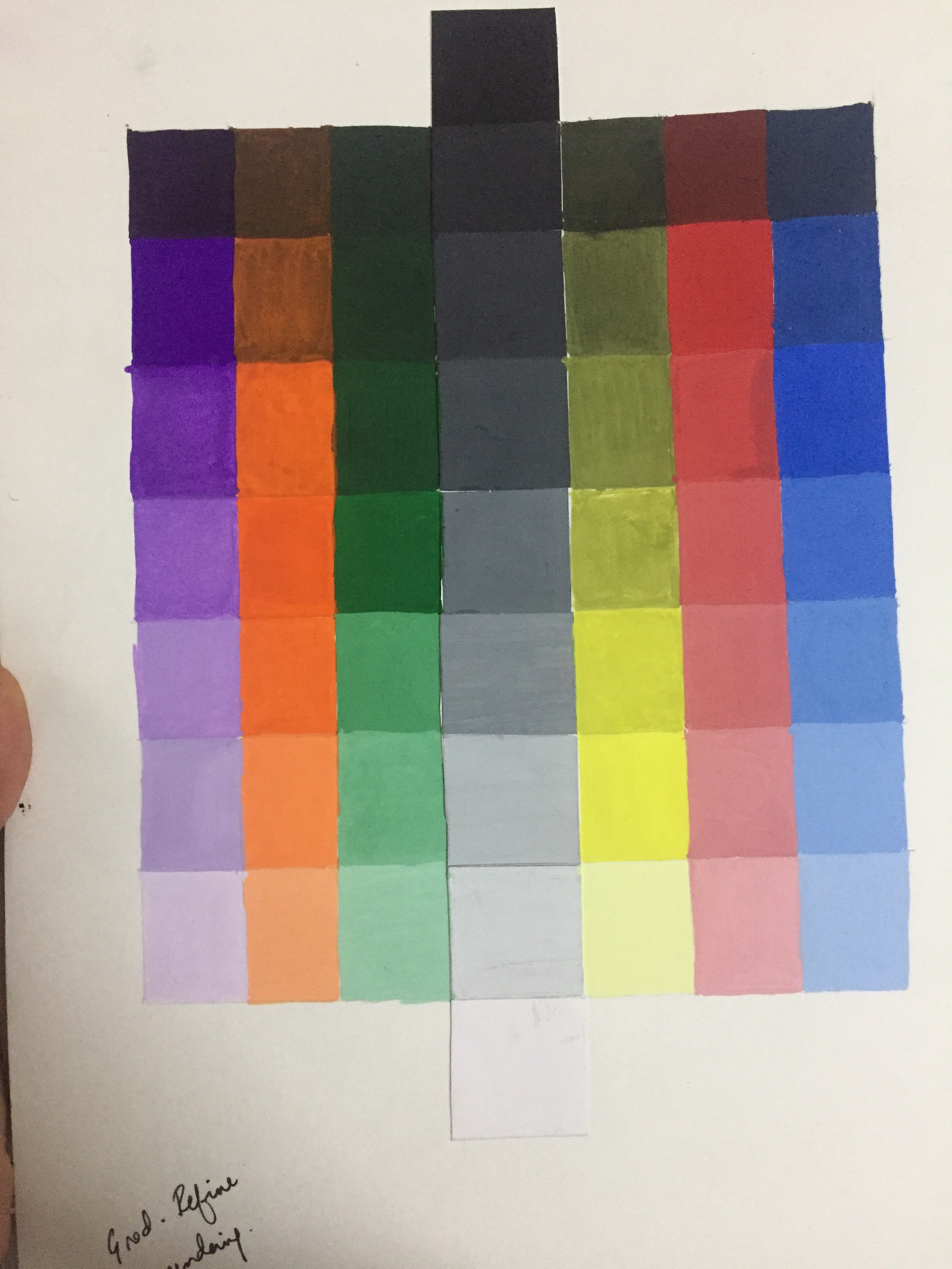 To understand the value(intensity of a colour) of each tint and tone of a colour, we made a gradation grid with white and black and then put the tints and tones of warm and cool colours.
