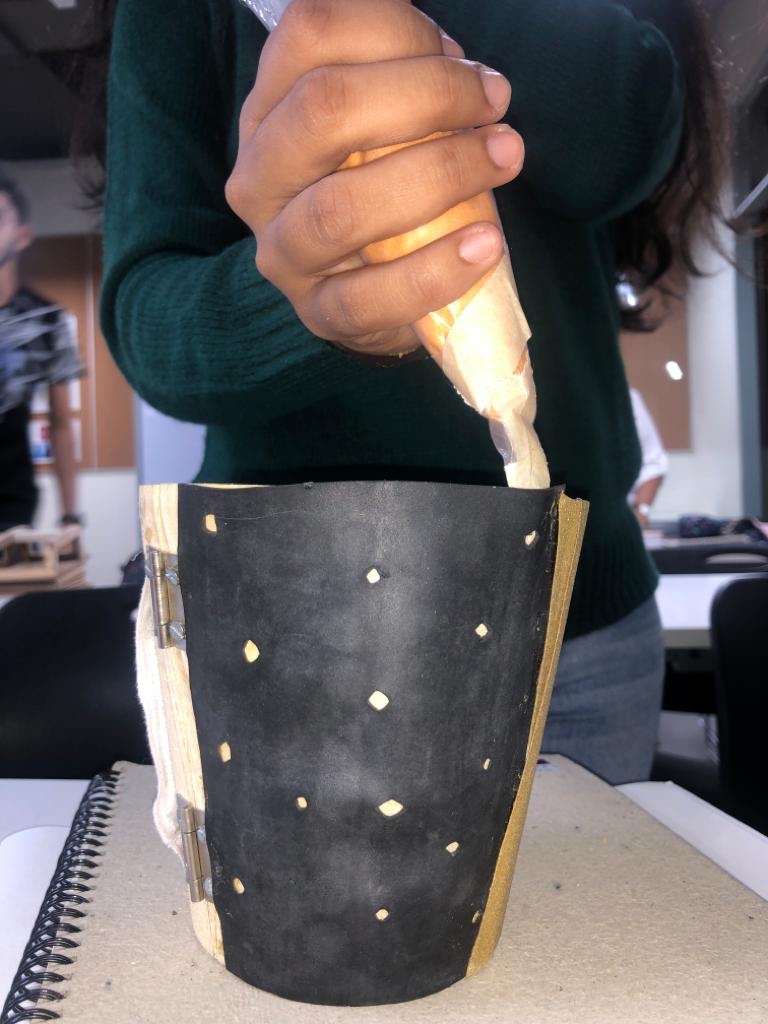 We made holes in the rubber and put kinetic sand in it. To make the holes we tried to use the drill machine but it didn’t happen so then we used scissors to make it.