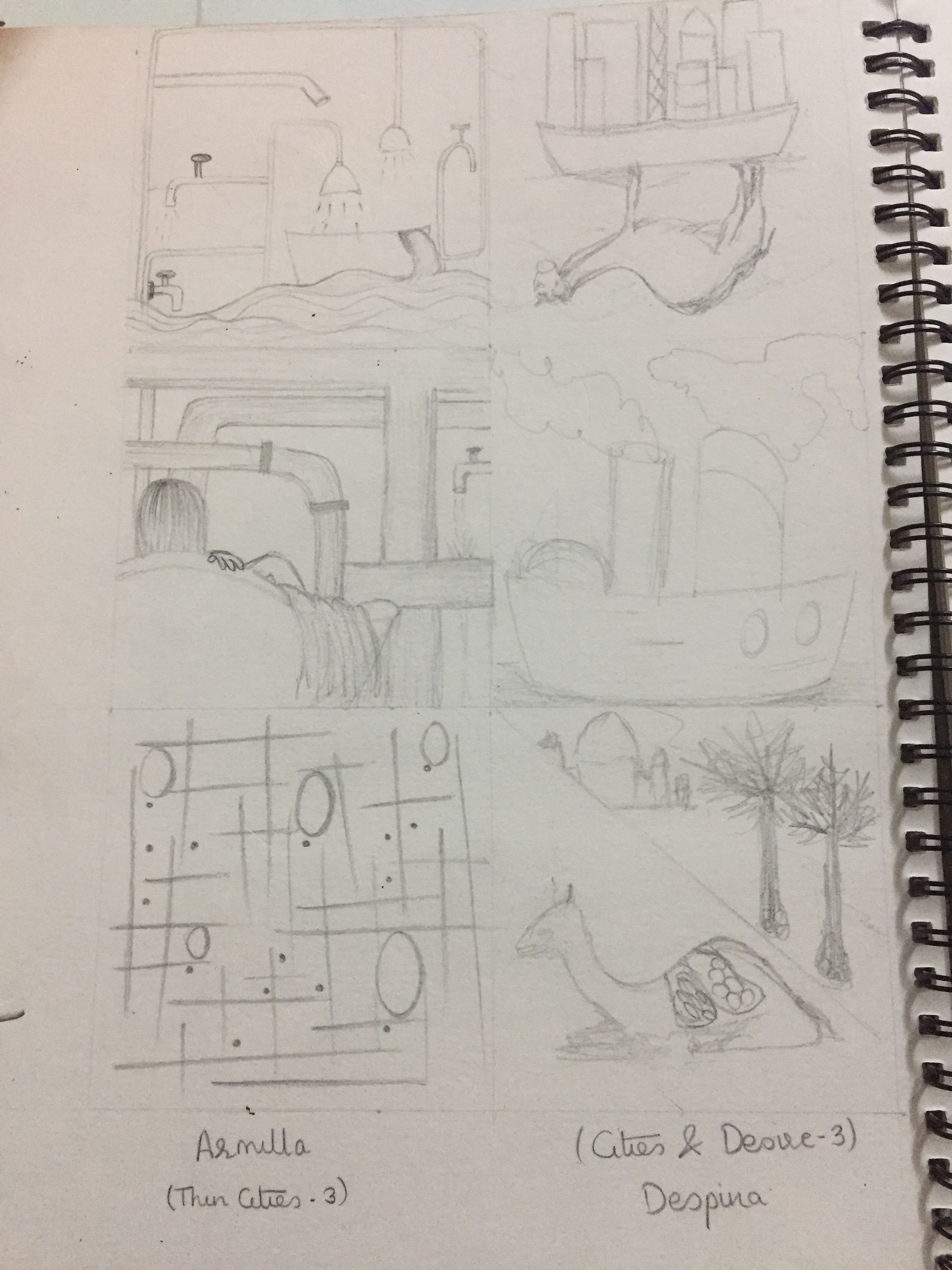 For our next assignment, we had to make 15 thumbnails based on certain aspects after reading any 5 chapters of the ‘INVISIBLE CITIES’. The aspects were natural elements,geographic location,people, culture, planning and structure, emotions, experiences, perception, history, events, diversity, uniqueness, etc. The judgement criteria’s being Imagination, experimentation, the number of thumbnails.