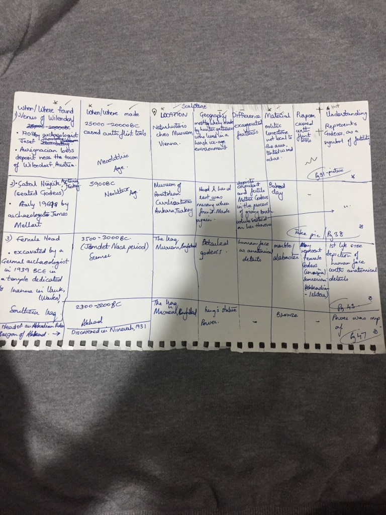 Malvika Ma’am had given us a list of civilisation whose information we had to find and could be used for the project. Out of those I chose Sumer,Akkad, Assyria,Egypt,Rome,Greece,Aztec and Palaeolithic and Neolithic ages. I referred to ‘La Rousse Encyclopedia of Prehistoric and Ancient Art’ as well as ‘Art History of the World’. The pictures that I took were also from these books.