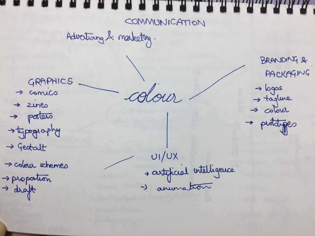 We even spoke about the importance of these categories and elements. A company needs branding for popularity, impression, presence, recognition, business. Logo design was one of the elements that we spoke about which includes graphics, visual representation, words, symbols, colour, tagline, typography, etc. I realized that these small elements had smaller sub-elements in it. After this we made mind maps for the discipline that we wanted to choose next year.