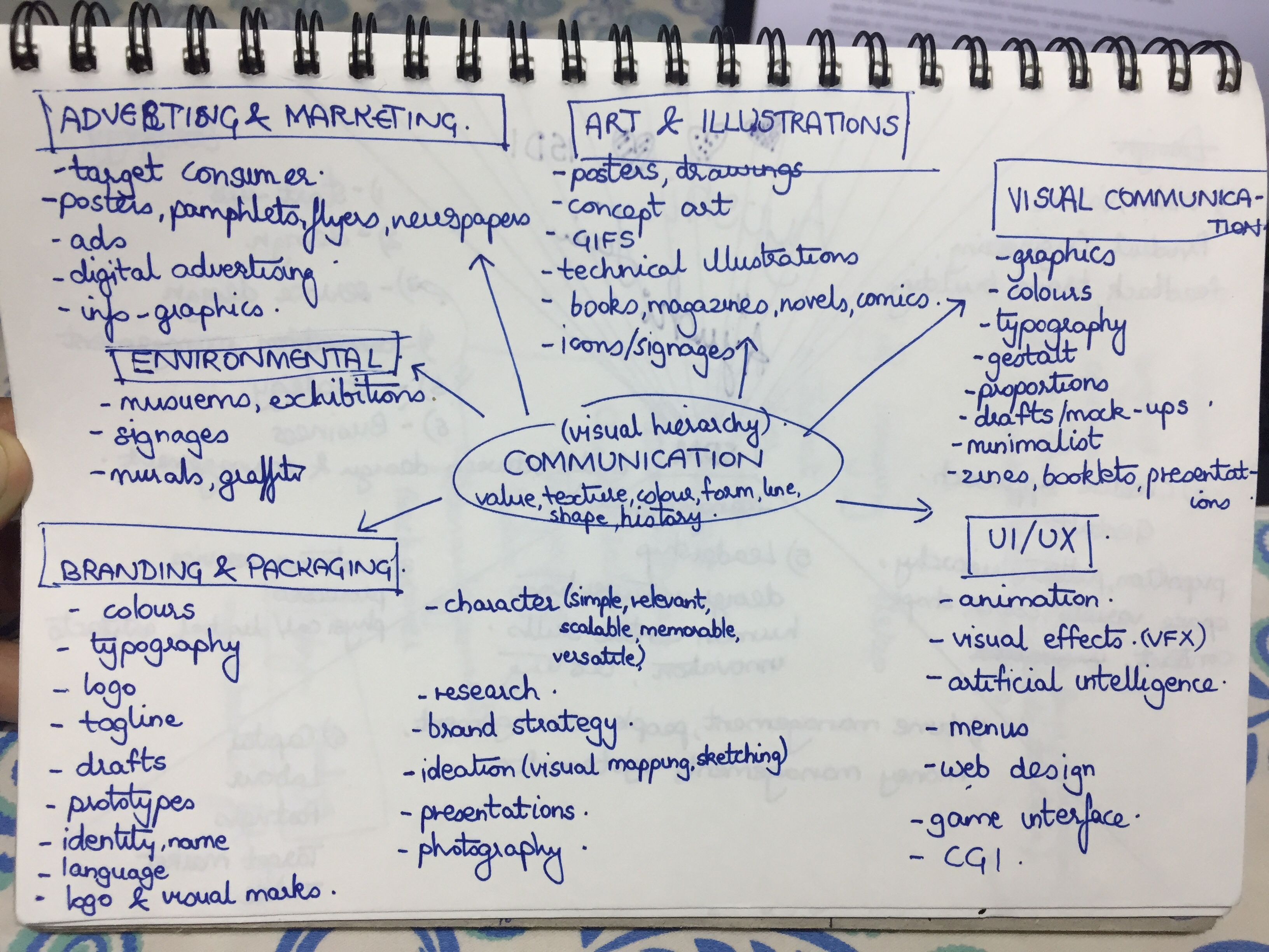 The core discipline that I chose was communication design. While making the mind map I realised that there were so many aspects and elements of communication design that were still left to explore. I saw maps made by my classmates to check the various aspects that they had put down. We even had discussions with each other about the same while we were trying to figure out what elements should come in what category. There were some elements that came in more than one category so I put them in both of them but in a different standpoint.